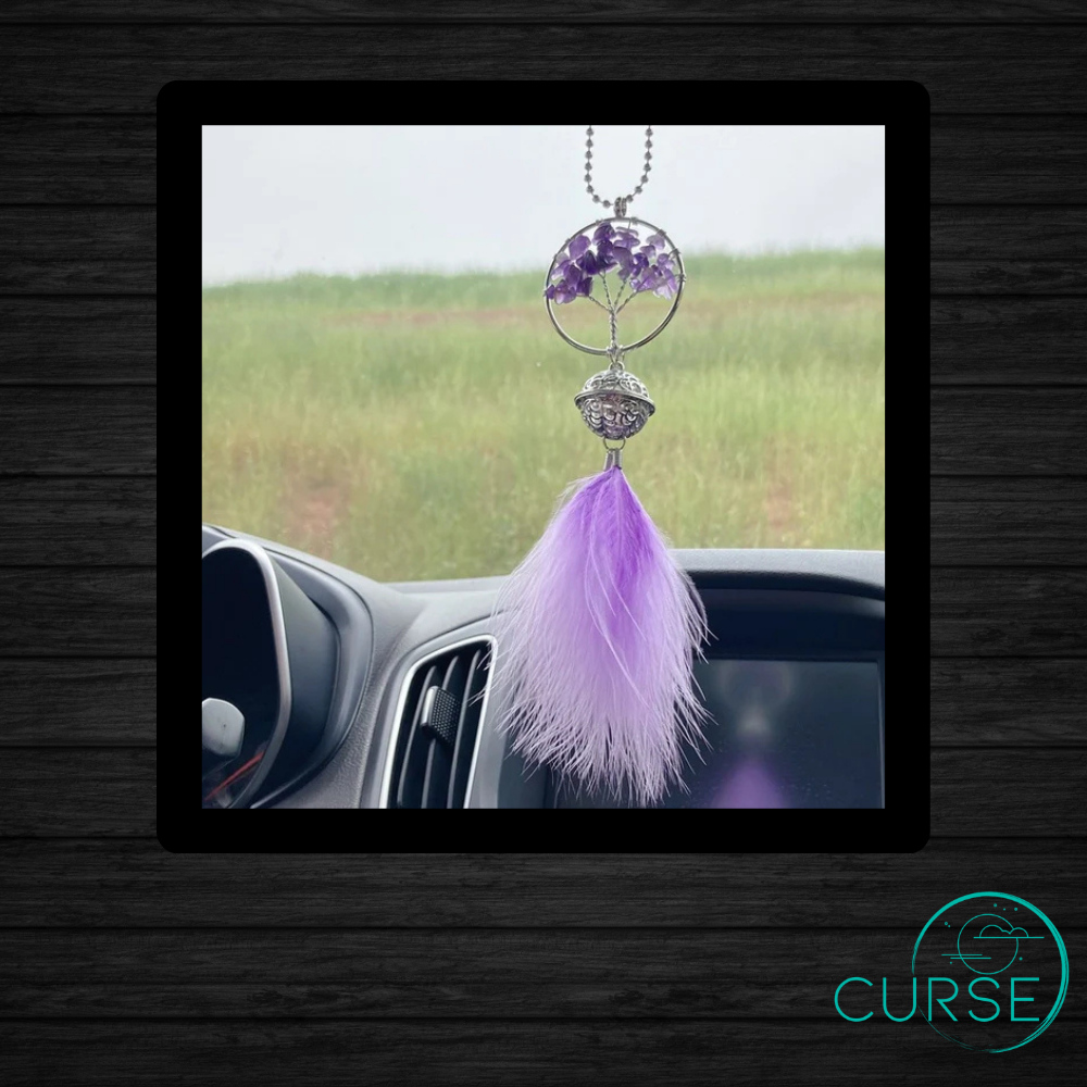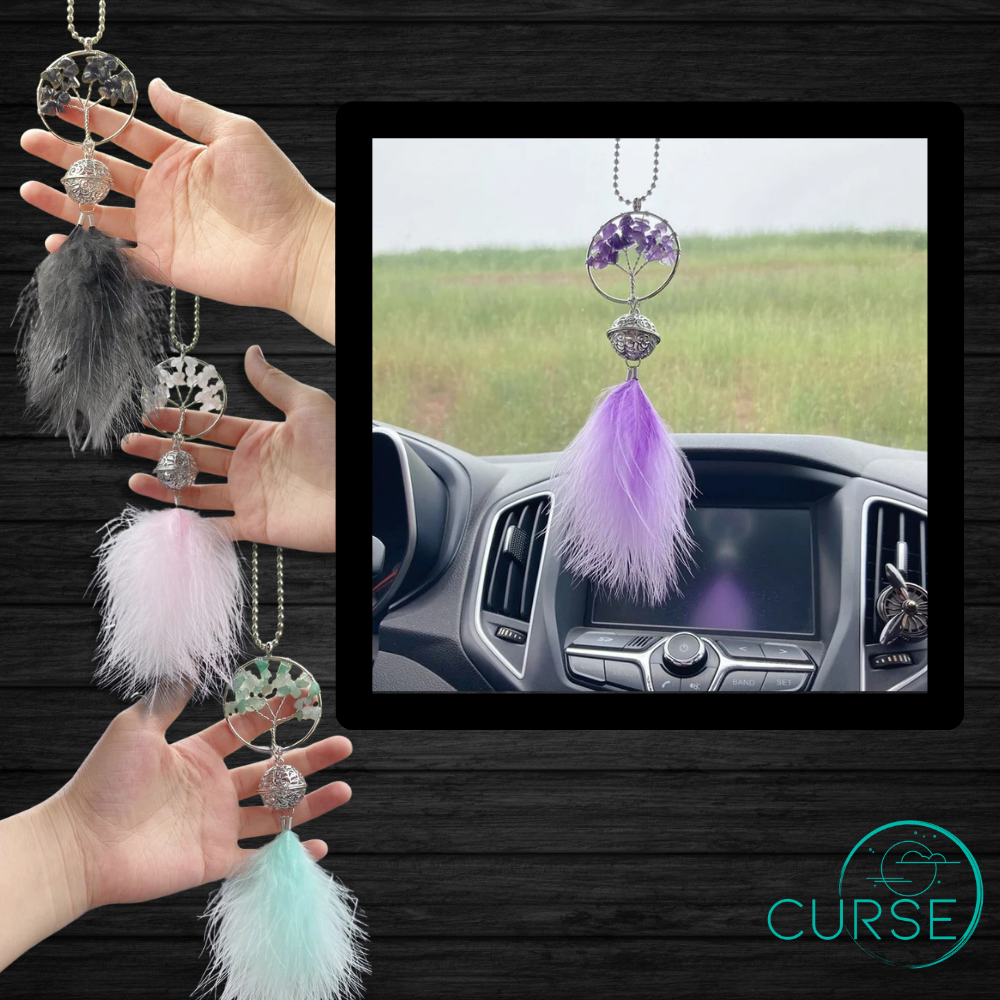 Car Hanger with Stones, Feathers, and a little spot where it holds a bell!