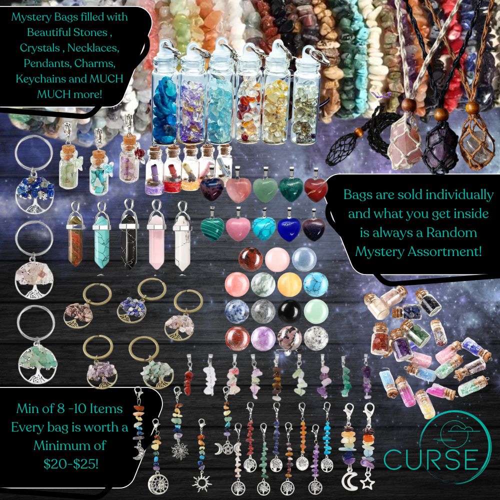 These are our little bags filled with happiness along with Mystery Bags filled with Beautiful Stones , Crystals , Necklaces, Pendants, Charms, Keychains and MUCH MUCH more!