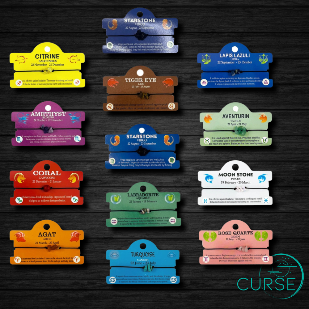 Celebrate each sign of the zodiac with a gemstone chosen to reflect its unique spirit. Every bracelet is beautifully displayed on a matching zodiac meaning card — featuring the stone name, zodiac sign, and symbolic meaning — making it the perfect mindful gift or collectible piece.